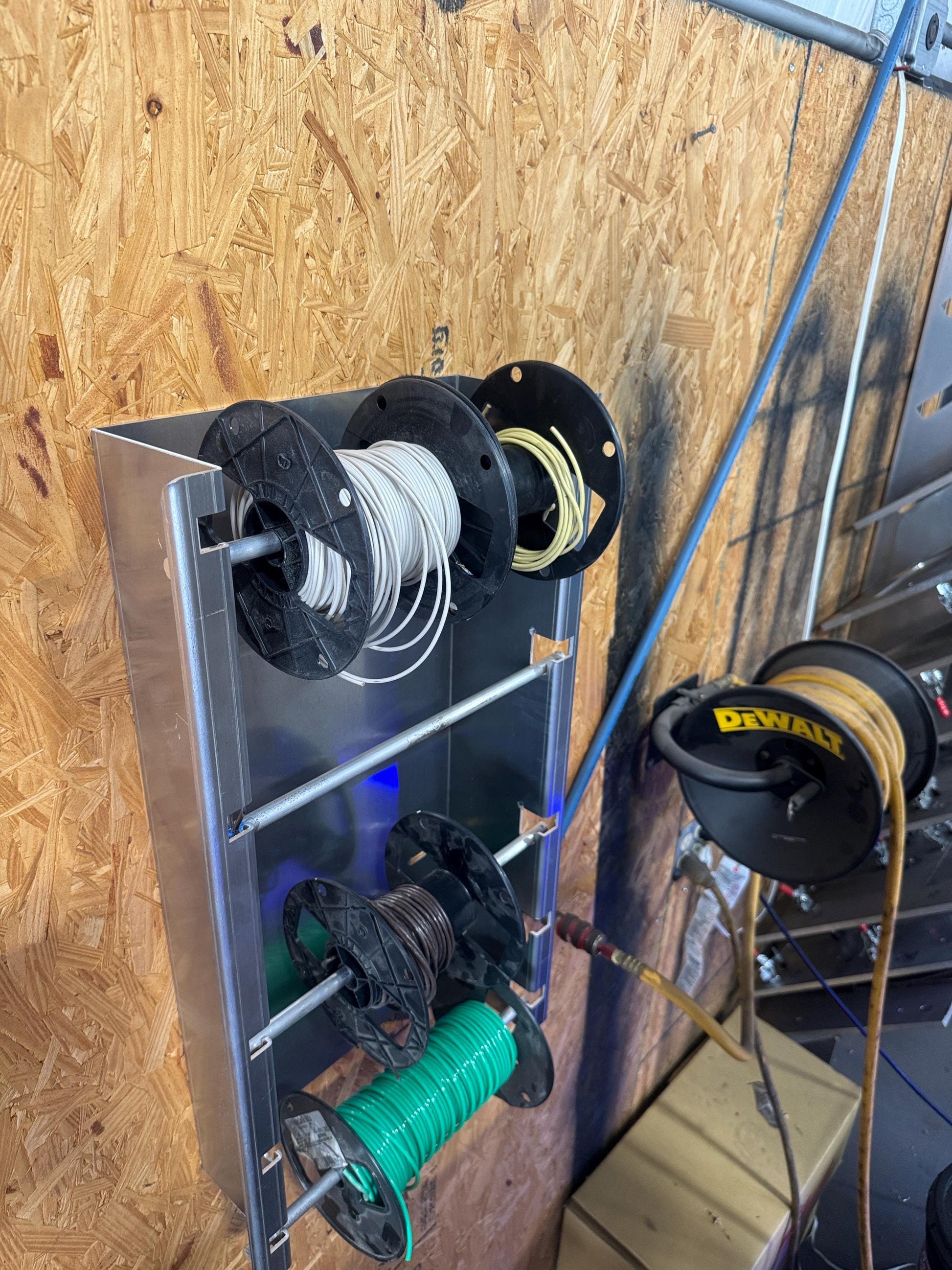 Rugged steel holder mounts on security partition, the wall of your van or the end panel of a shelf unit. Up to five rods are automatically held in place with gravity and are removable with one hand. Specifically designed to meet the demands of electrical, plumbing and HVAC contractors, this rack adds reel storage capacity without sacrificing floor space. Bottom two reel sections are sized for smaller diameter reels to fit your needs.