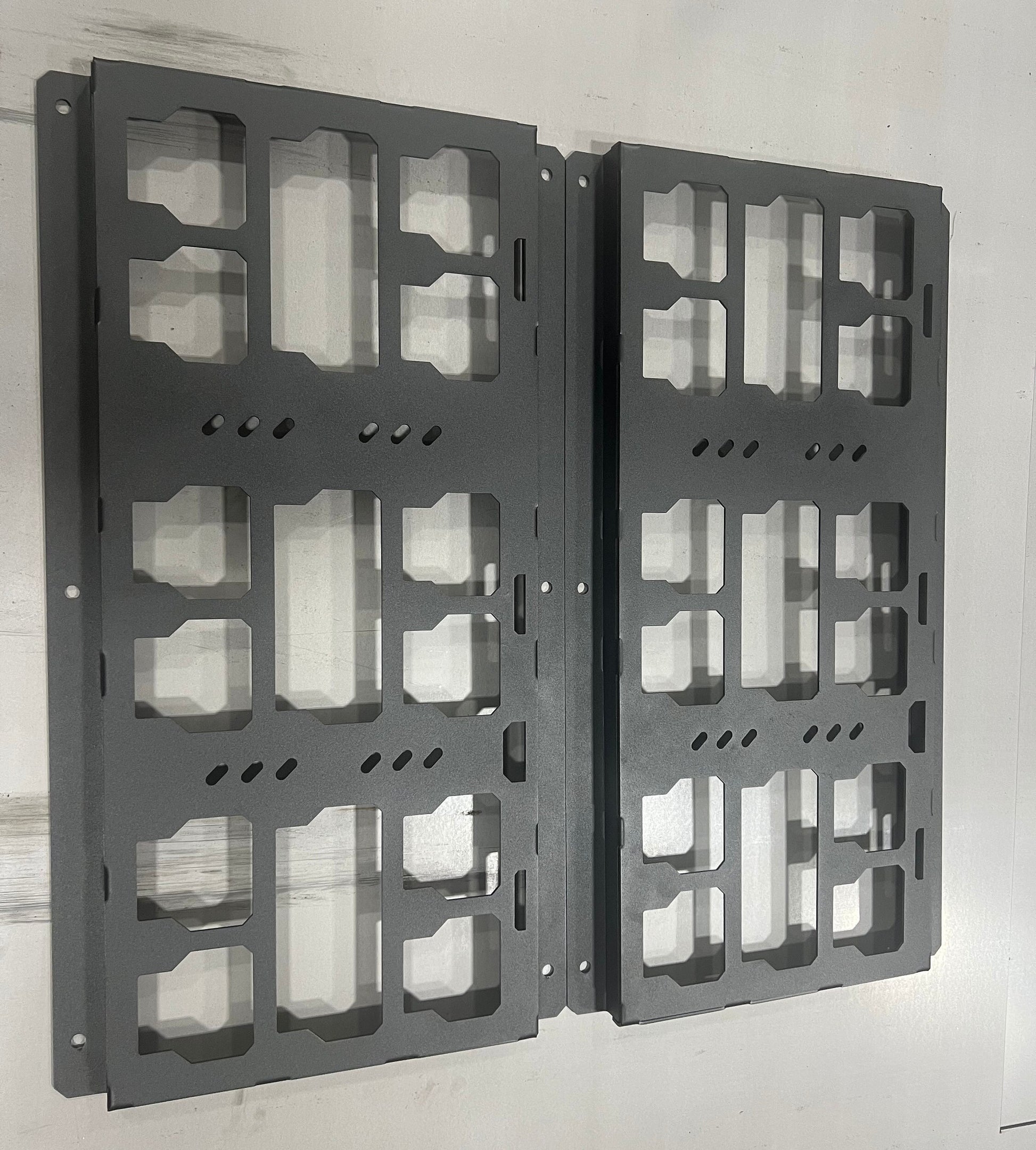 1- Milwaukee Packout Mounting Plate holds ONE FULL SECTION and ONE-HALF SECTION. outside to outside measurements are 16x30 Made from 1/8 thick ALUMINUM Powder coated for year of abuse on the job site or tool shed. This universal Packout mount is designed to bolt to any flat surface including UTV beds, Truck beds, Truck Van Walls and workshop walls. SOLD Individually Packout are for visual and are not included in the listing. 1/8th carbon steel powder coated black textured. other version for purchase in the shop ************ bulk orders welcome message for more info **************************